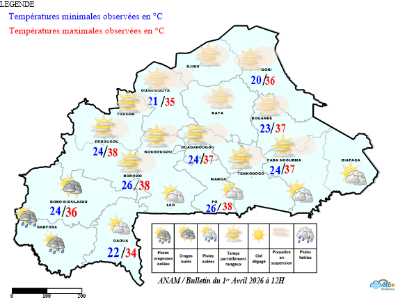 - Le territoire a été sous l’influence d’harmattan avec des vents modérés sous un ciel en général peu nuageux à nuageux.