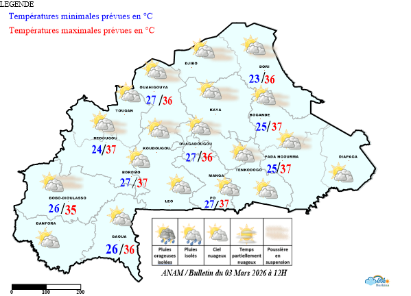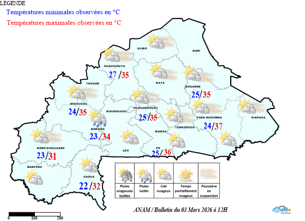- Le ciel a été en général très nuageux à couvert par moments occasionnant des pluies faibles par endroits permettant d’enregistrer des traces de pluie à Boromo.