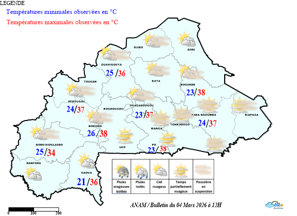 - L’ensemble du pays a été sous l’influence des vents d’harmattan faibles à modérés, sous un ciel en général nuageux.