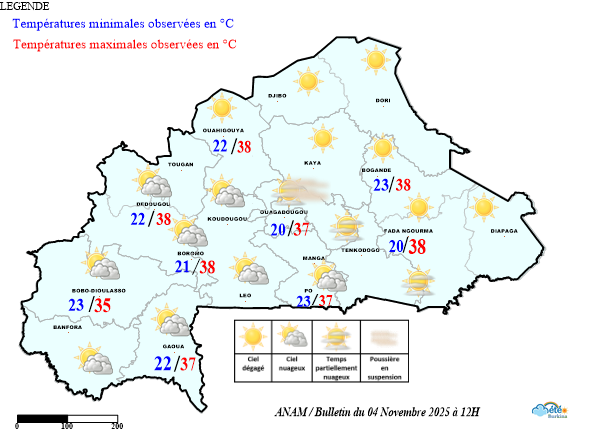 - Au cours des dernières 24 heures, le pays a été sous l’influence des vents d’harmattan avec des incursions de flux mousson sur sa partie sud.