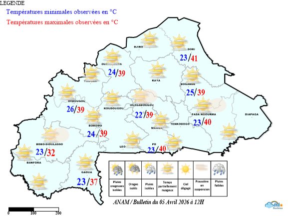 - Les vents d’harmattan ont soufflé sur la quasi-totalité du territoire, avec toutefois des incursions de flux de mousson sur certaines localités de la partie sud du territoire, sous un ciel partiellement nuageux.