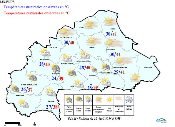 - Le ciel a été en général nuageux, avec des orages et des pluies isolés sur certaines localités dans la moitié sud du territoire. Ainsi a titre indicatif 17,9 mm de pluie ont été enregistré à Boromo entre 09 h hier et 09 h aujourd’hui.