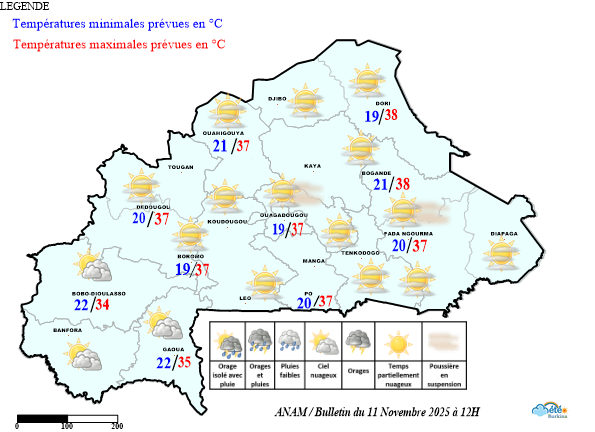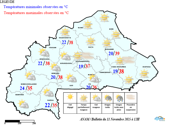 - Durant les dernières 24 heures, on a observé l’influence de l’harmattan sur la majeure partie du pays avec des incursions de mousson dans sa partie Sud-Ouest.