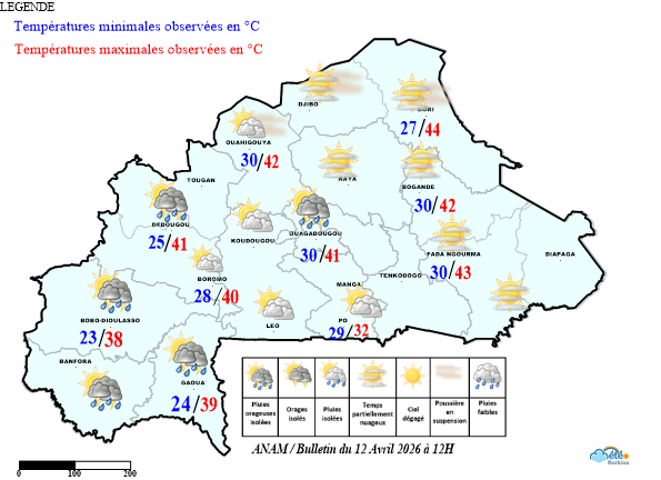 - Ainsi entre 09 heures hier et 09 heures ce matin, on a enregistré 12,7 mm de pluie à Gaoua ; 4 mm à Bobo-Dioulasso ; 3 mm à Dédougou et 0,7 mm à Ouagadougou.