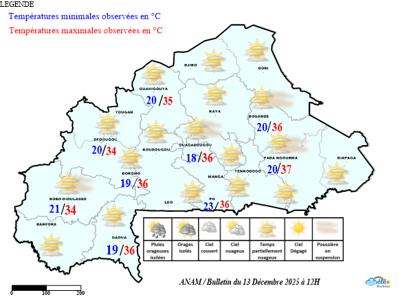 - La majeure partie du territoire a été sous l’influence de l’harmattan avec des incursions de mousson dans le Djôrô et les Tannounyan. Le ciel a été en général partiellement nuageux à couvert par endroits.