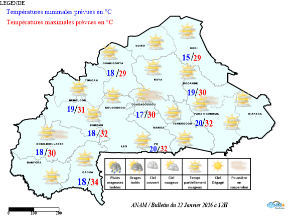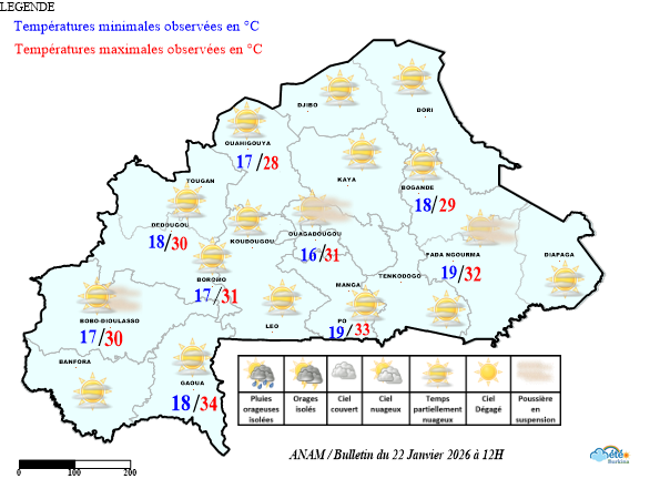 - Le temps des dernières 24 heures a été marqué par l’influence de l’harmattan sur le pays sous un ciel en général partiellement nuageux.