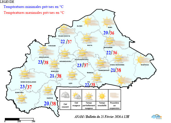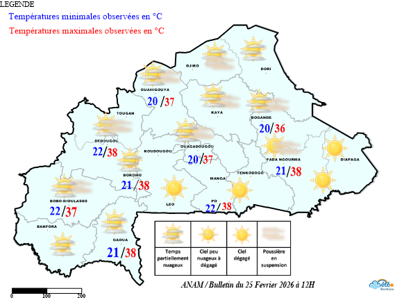 - Au cours des dernières 24 heures, le régime d’harmattan faible à modéré a été observé sur l’ensemble du territoire, avec un ciel dégagé à peu nuageux.
