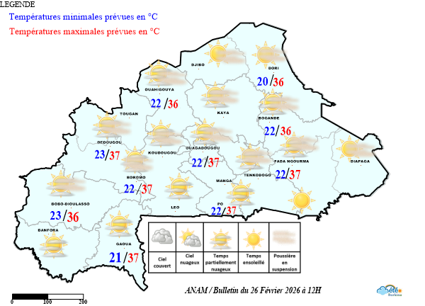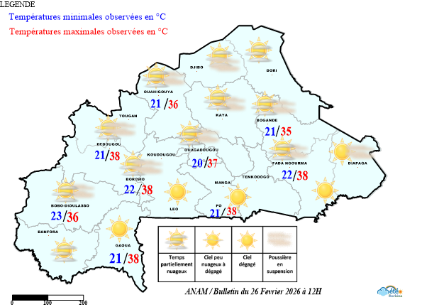 - Le régime d’harmattan faible à modéré a été observé sur l’ensemble du territoire, avec un ciel partiellement nuageux.