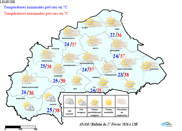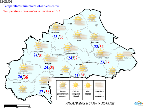 - Au cours des dernières 24 heures, le territoire est resté sous l’influence du régime d’harmattan faible à modéré, avec un ciel partiellement nuageux.