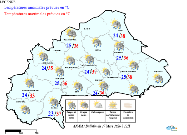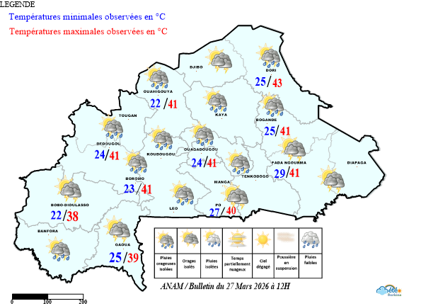 - A titre indicatif, entre 09 heures hier et 09 heures aujourd’hui, on a enregistré : 31,3 mm de pluie à Boromo, 18,1 mm à Ouahigouya, 6,6 mm à Ouagadougou, 5,8 mm à Dori et 0,1 mm à Bogandé et à Dédougou.